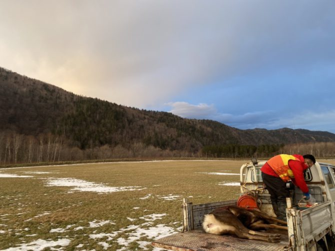 獲物を発見し、まだ息がある場合は確実に「止め刺し」を行い、肉の品質を保つために速やかに「内臓出し(一次処理)」を一人で完了させる必要があります。冬の北海道であっても、内臓を入れたまま放置すると体温で肉の腐敗が進行し、ガスが溜まって食べられなくなってしまうからです。